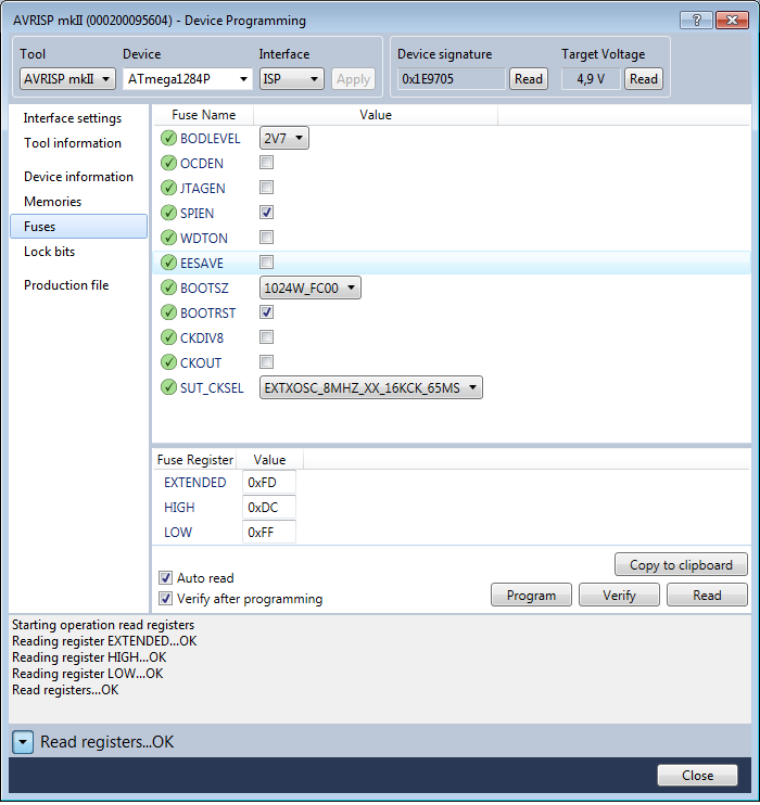 Die Firmware habe ich mit Atmel Studio in C geschrieben. Normalerweise verwende ich gerne Bascom, aber für die FFT Berechnung ist Bascom nicht so wirklich geeignet. Bevor die Firmware eingespielt werden kann, müssen noch folgende FUSEBITs