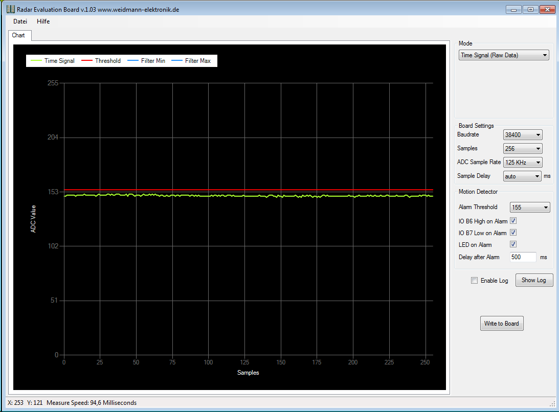 Im Hauptfenster sehen wir auf der linken Seite die Signalverarbeitung. Auf der rechten Seite gibt es ein paar Einstellmöglichkeiten für das Board. Alle Einstellungen werden auf dem Board gespeichert und werden auch beim Offline Bewegungsmelder
