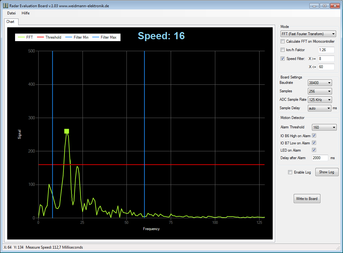 FFT (Fast Fourier Transformation) | Die gesampelten Daten werden per FFT in Frequenz und Signalstärke umgerechnet. Das ist für eine Geschwindigkeitsmessung nötig. Es kann hier noch gewählt werden, ob die FFT am Pc oder im Controller (langsamer und etwas schlechter, da FixPoint FFT) gerechnet werden soll. Über den km/h Faktor, lässt sich das Ergebnis in km/h umrechnen. Des Weiteren lässt sich der Geschwindigkeitsbereich (Min/Max) über den Speed Filter einschränken. |